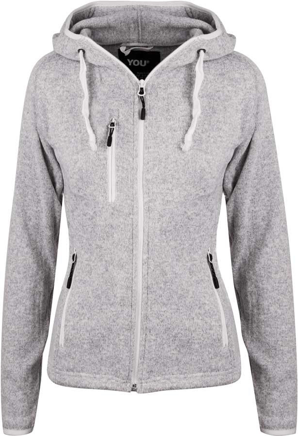 Let figursyet hættetrøje til kvinder, i grå melange fleece med dekorative hvide kontrast detaljer.