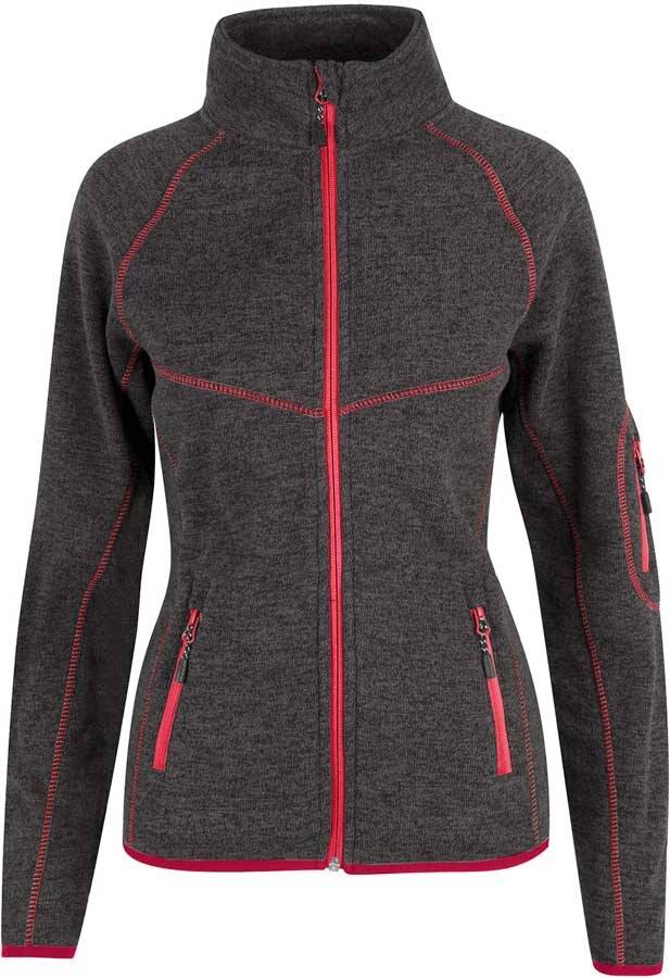Figursyet fleece cardigan til kvinder, i flot koksgrå melange, med dekorative flatlock sømme og kontrast detaljer i klar rød.