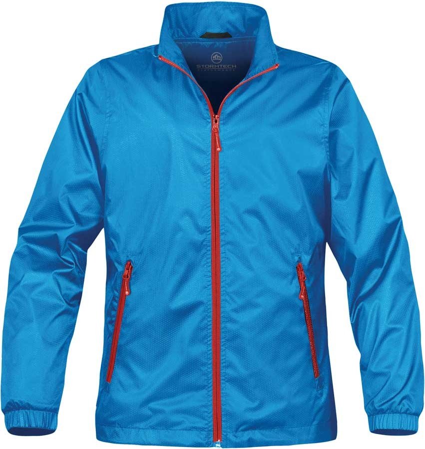 Skaljakken er blå med tomatrøde lynlåse og lavet i et meget slidstærkt og vandafvisende materiale. Der er meshfor for ekstra komfort.