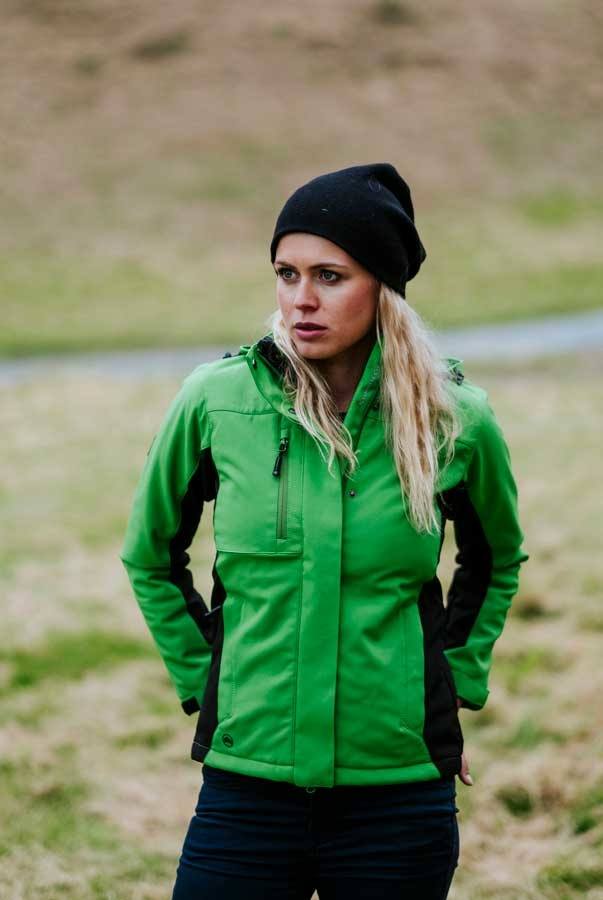 Damejakken har et sporty look med sorte paneler under ærmerne og ned langs siderne.