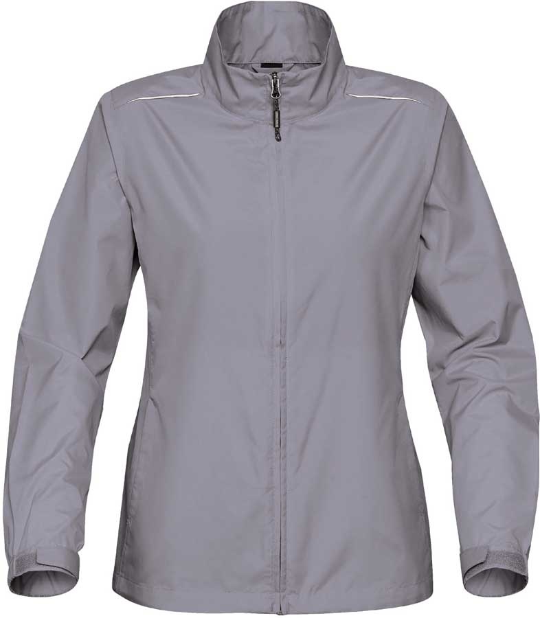 Sporty sølvgrå, ultrablød og let skaljakke til kvinder, med STORMTECH D/W/R teknologi. Vandafvisende yderskal med meshfoer og ekstra ventilation i ryggen for maksimal komfort.