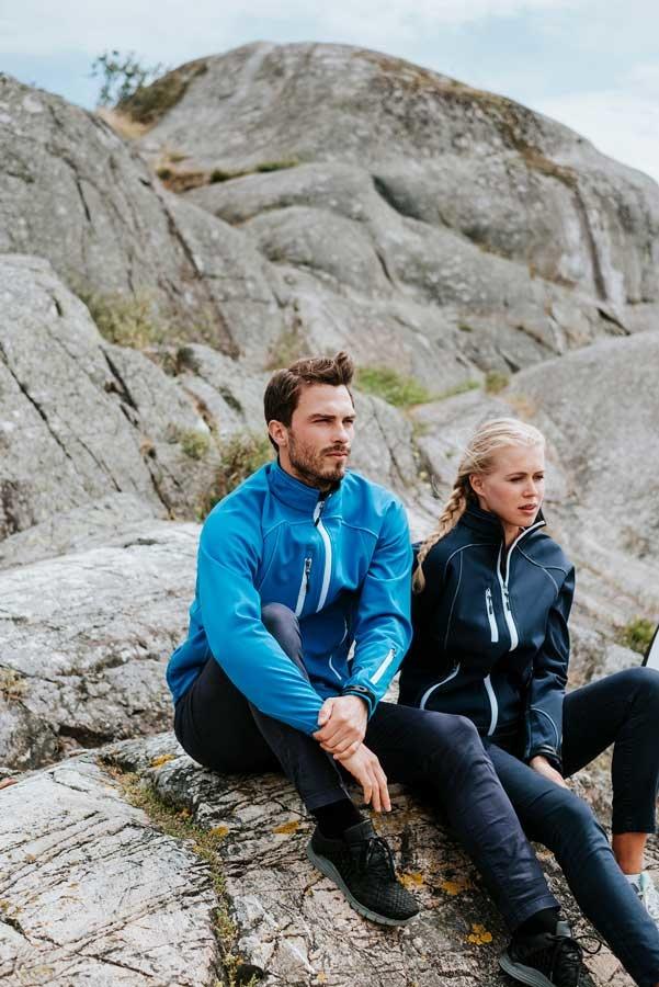 Praktisk kornblå unisex shoftshell jakke med flotte hvide dekorative stikninger.