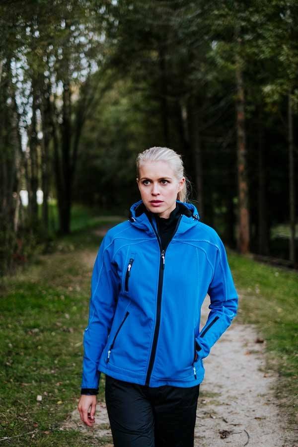 Sporty stretch softshell damejakke i kornblå med sorte lynlåse og pyntesømme som flot kontrast.