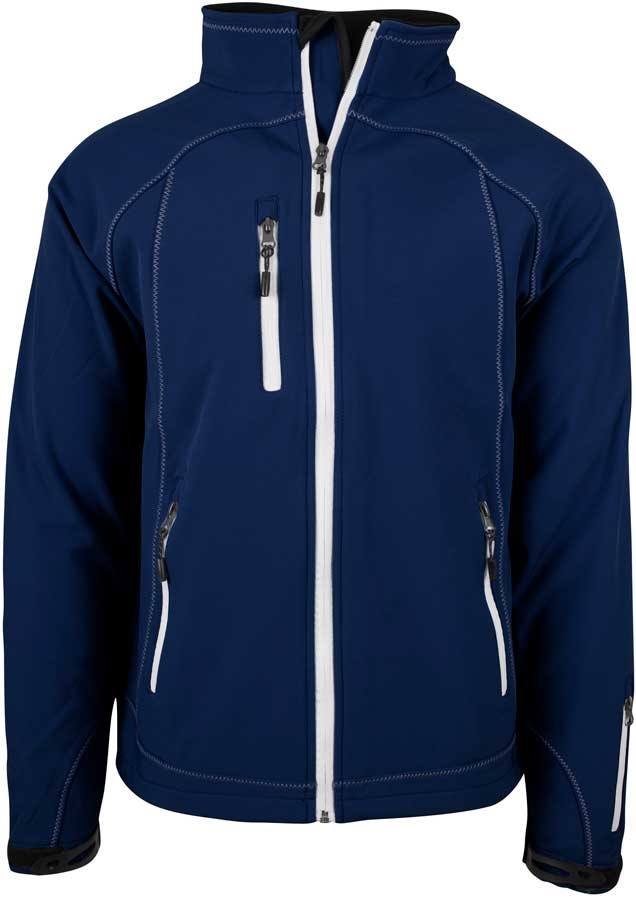 Praktisk navyblå unisex softshell-jakke med flotte dekorative hvide stikninger.