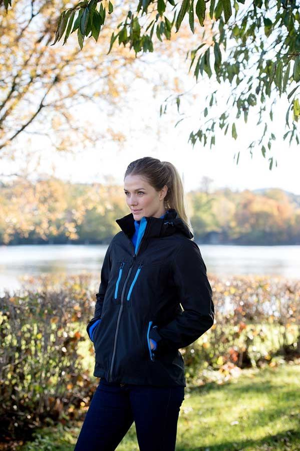 Teknisk softshell jakke til damer, i sort med cool blå detaljer.