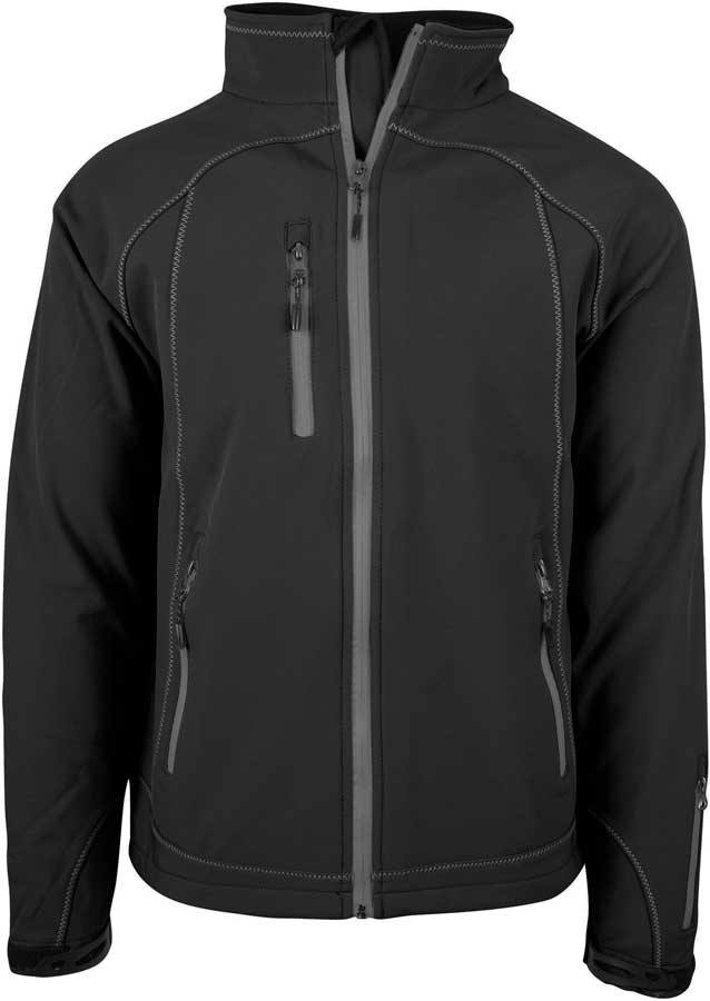 Praktisk sort unisex shoftshell jakke med flotte grå dekorative stikninger.