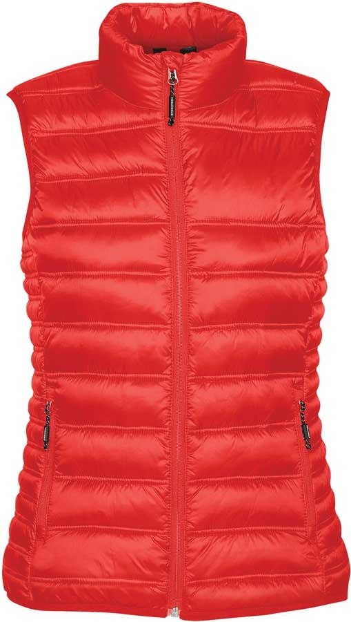 Lækker rød, vatteret vest til damer. Vesten er vandafvisende og ultralet. Den er lige til at pakkes sammen i den ene sidelomme.