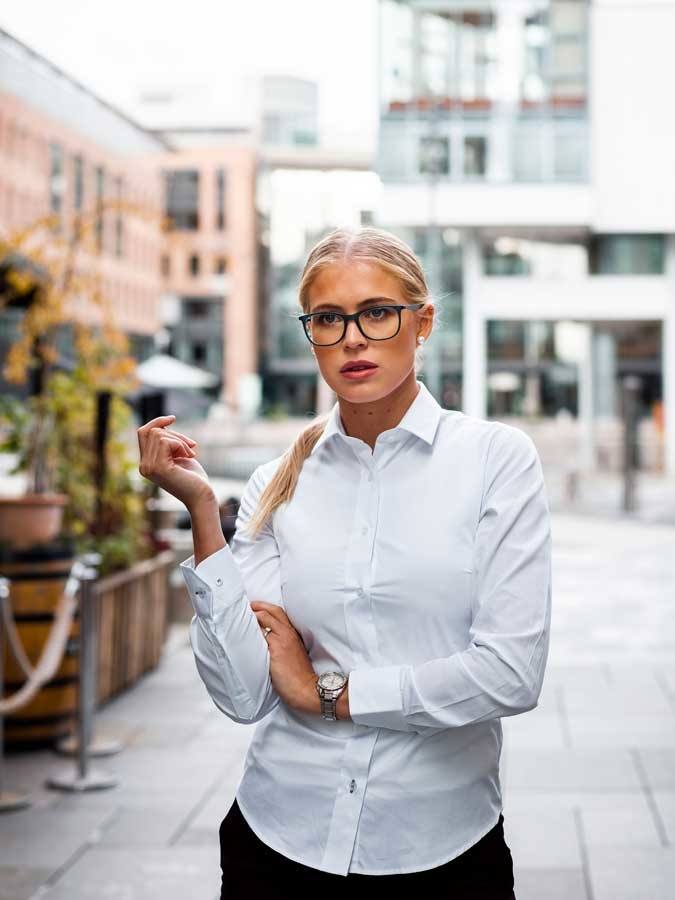 Hvid figursyet dame business skjorte med kontrastfarvet piping indvendig i kraven.