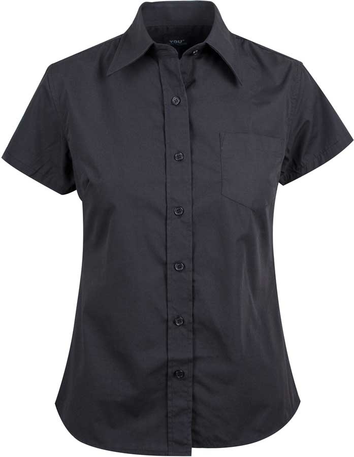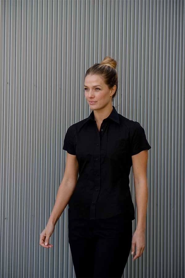 Sort figursyet poplinskjorte til damer, med brystlomme og korte ærmer.