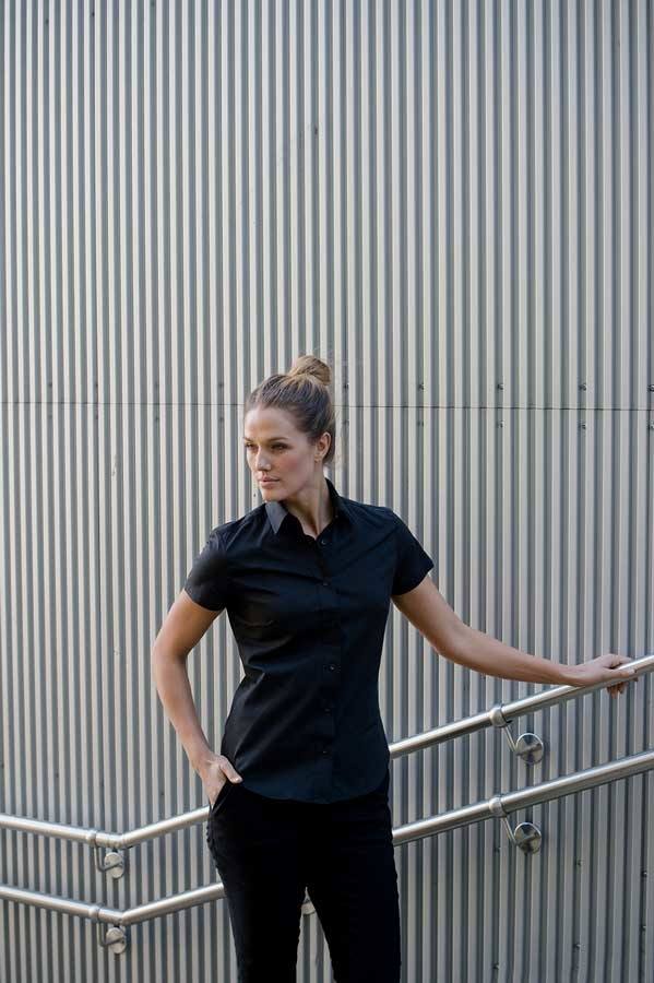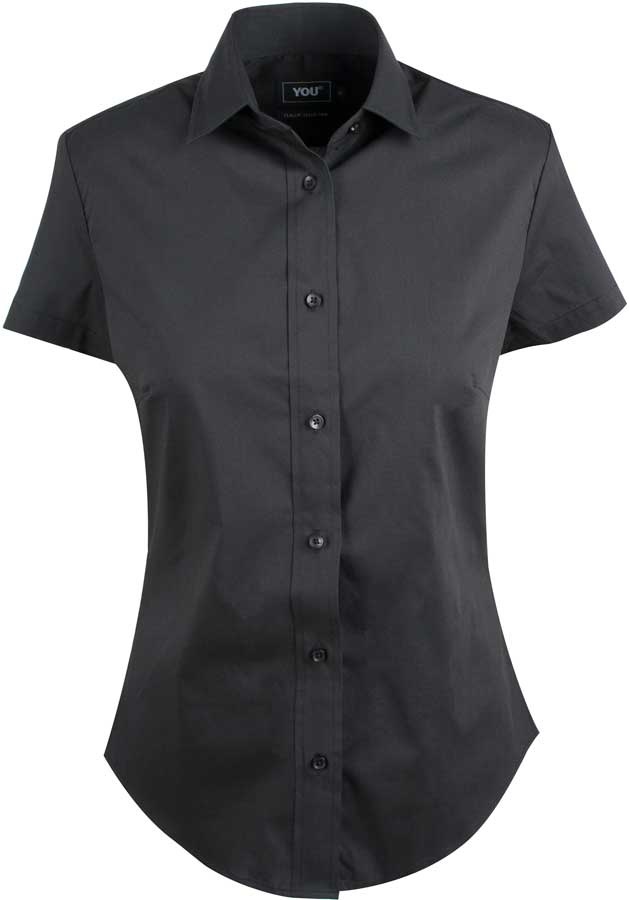 Let sort figursyet stretchskjorte med korte ærmer til kvinder.