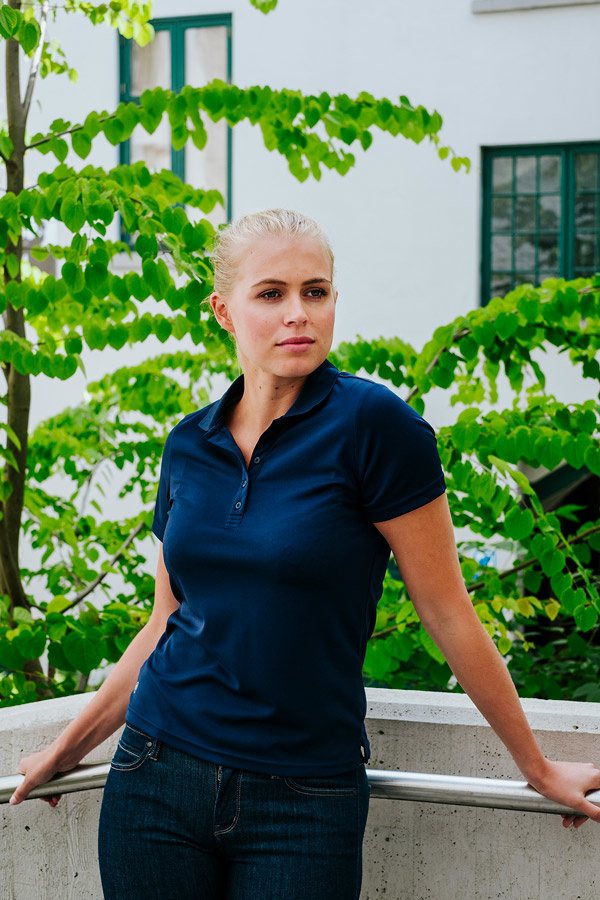 Slidstærk og superlet sort polo i mikropique til kvinder, med mange lækre detaljer som sideslids, stolpe med tre knapper og rib i kraven.