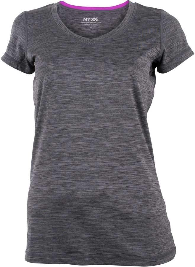 Sporty og feminin grå melange T-shirt med V-hals til dame. Blusen har fuchsia kontrastfarve i nakken og refleksdetaljer på ærmerne.