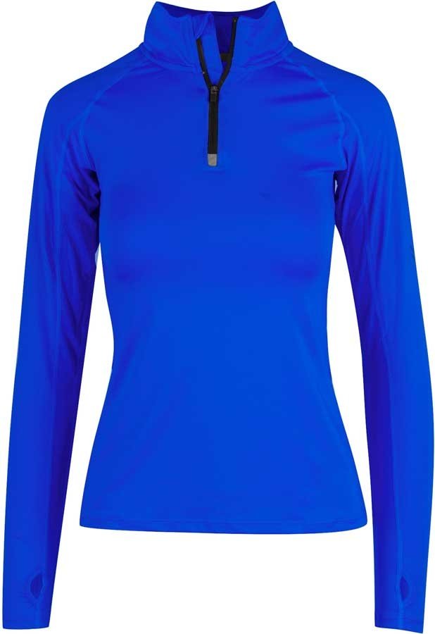 Sporty kornblå T-shirt til kvinder, med lange ærmer og lynlås i halsen.