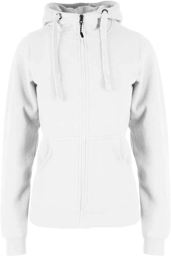 Dejlig hvid hættejakke til kvinder. Jakken er dobbelt jersey strikket og med børstet blød inderside. Jakken er figursyet. Den er med rib-kant på ærmerne samt forneden på jakken. Ribben er med lycra.