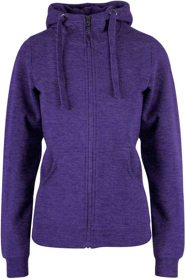 Dejlig lilla meleret hættejakke til kvinder. Jakken er dobbelt jersey strikket og med børstet blød inderside. Jakken er figursyet. Den er med rib-kant på ærmerne samt forneden på jakken. Ribben er med lycra.