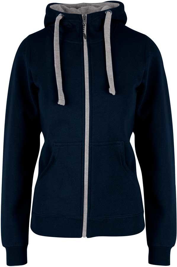 Dejlig navy blå hættejakke med kontrast til kvinder. Jakken er dobbelt jersey strikket og med børstet blød inderside. Jakken er figursyet. Den er med rib-kant på ærmerne samt forneden på jakken. Ribben er med lycra.