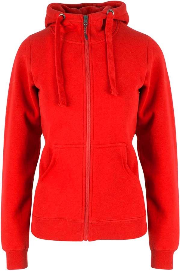 Dejlig rød hættejakke til damer. Jakken er dobbelt jersey strikket og med børstet blød inderside. Jakken er figursyet. Den er med rib-kant på ærmerne samt forneden på jakken. Ribben er med lycra.