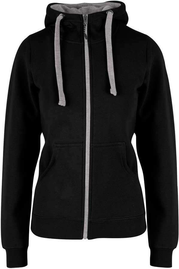 Dejlig sort hættejakke med kontrast til kvinder. Jakken er dobbelt jersey strikket og med børstet blød inderside. Jakken er figursyet. Den er med rib-kant på ærmerne samt forneden på jakken. Ribben er med lycra.
