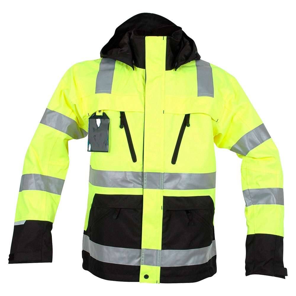 Gul, åndbar og regntæt arbejdsjakke med reflekser fra Ocean. Jakken har YKK lynlås og dobbelt overfald i front med knap- og velcrolukning.
