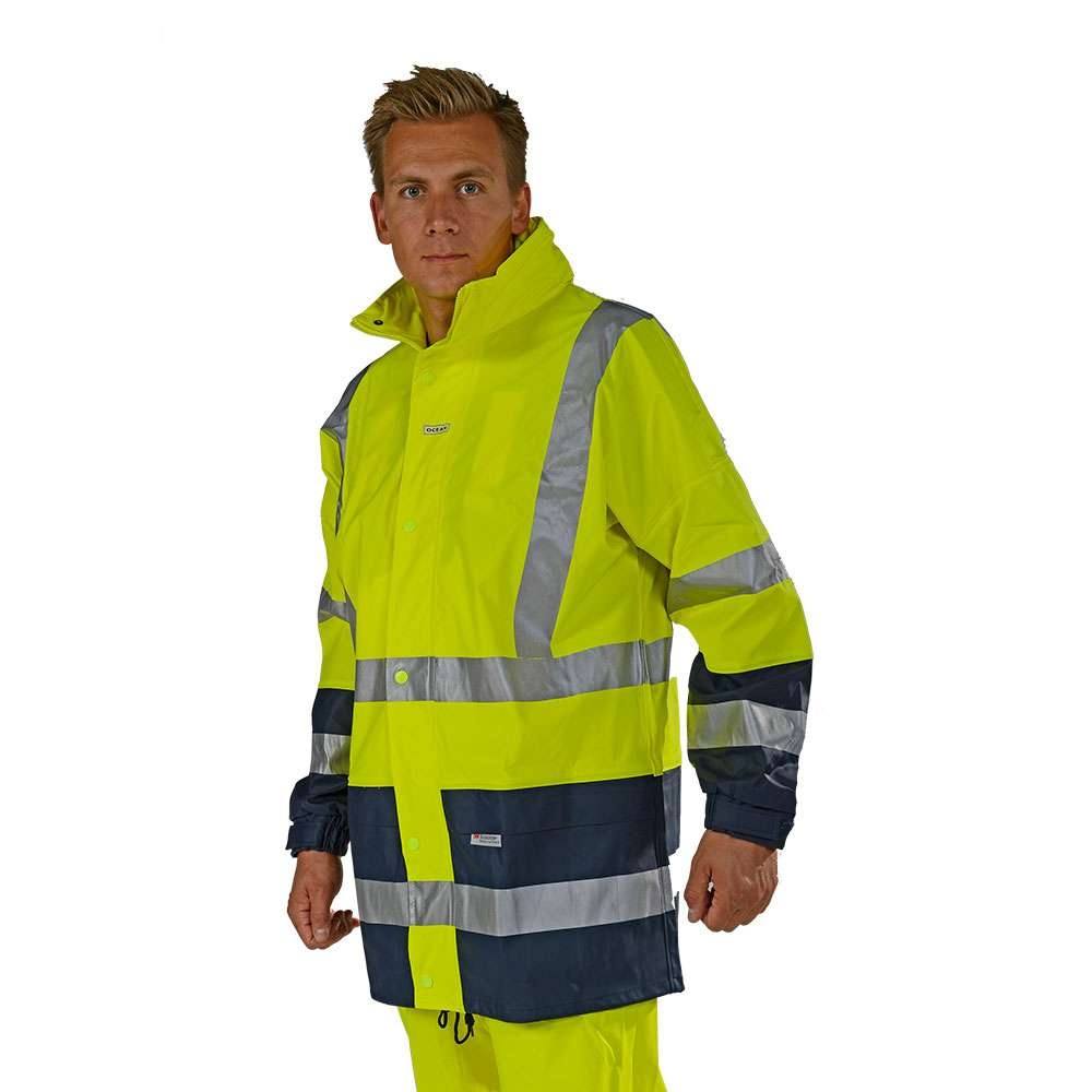 Gul/navy Comfort stretch arbejdsjakke i blødt og smidigt materiale, som er rivefast og kuldebestandigt. Jakken har YKK lynlås og knapper fortil. Den har to lommer foran med lommeklap.