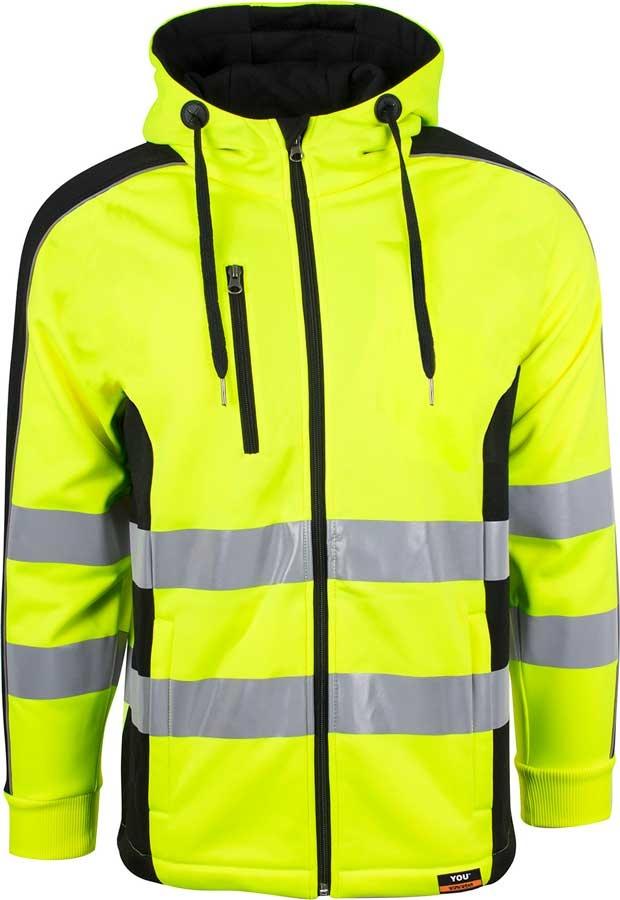 Jakken er neon gul med sorte kontrastfelter i siden og langs ærmerne, hvor der også er reflekspiping.