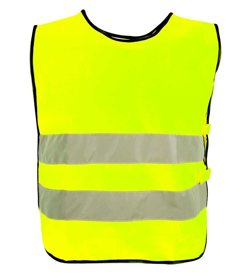 Vesten er neon gul med påsyede refleks striber om livet og sorte kanter.