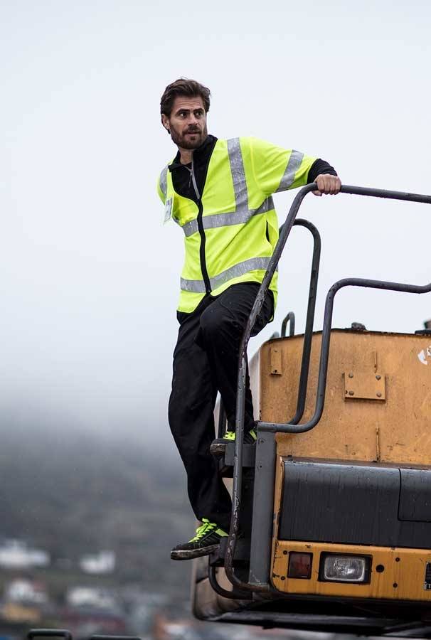 Neon gul Unisex refleksvest til arbejdsbrug med påsyede reflekser om livet, på skuldre og ærmer.