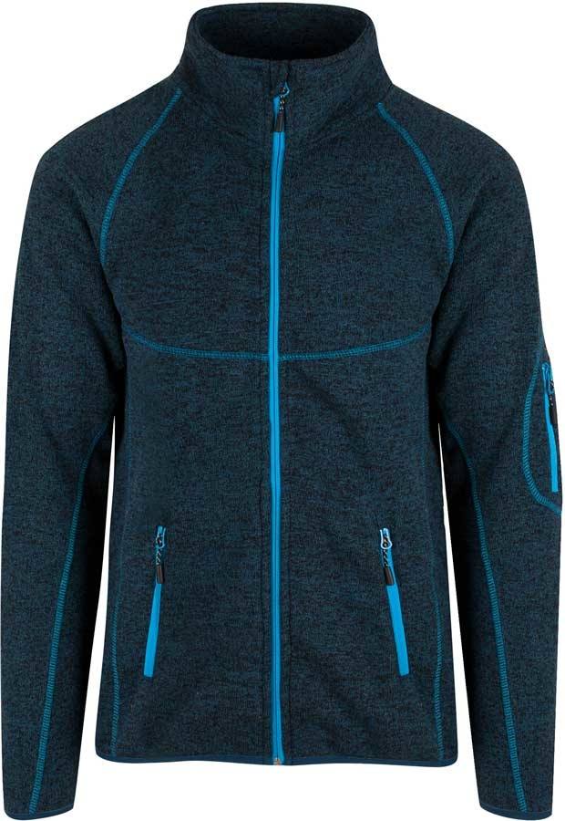 Figursyet fleece cardigan til mænd, i smart meleret denimblå, med dekorative flatlock sømme og kontrast detaljer i klar turkis.