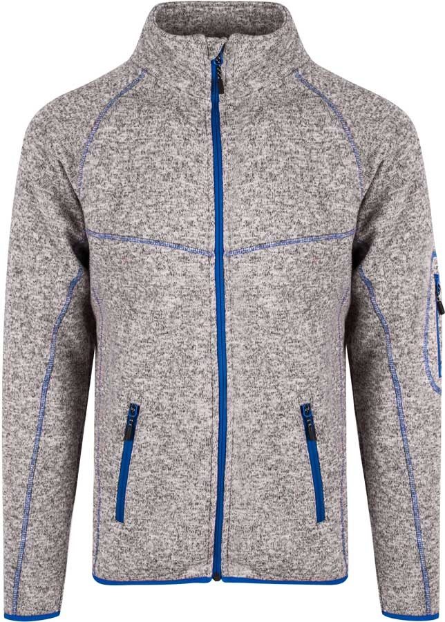 Figursyet fleece cardigan til mænd, i flot grå melange, med dekorative flatlock sømme og kontrast detaljer i frisk blå.