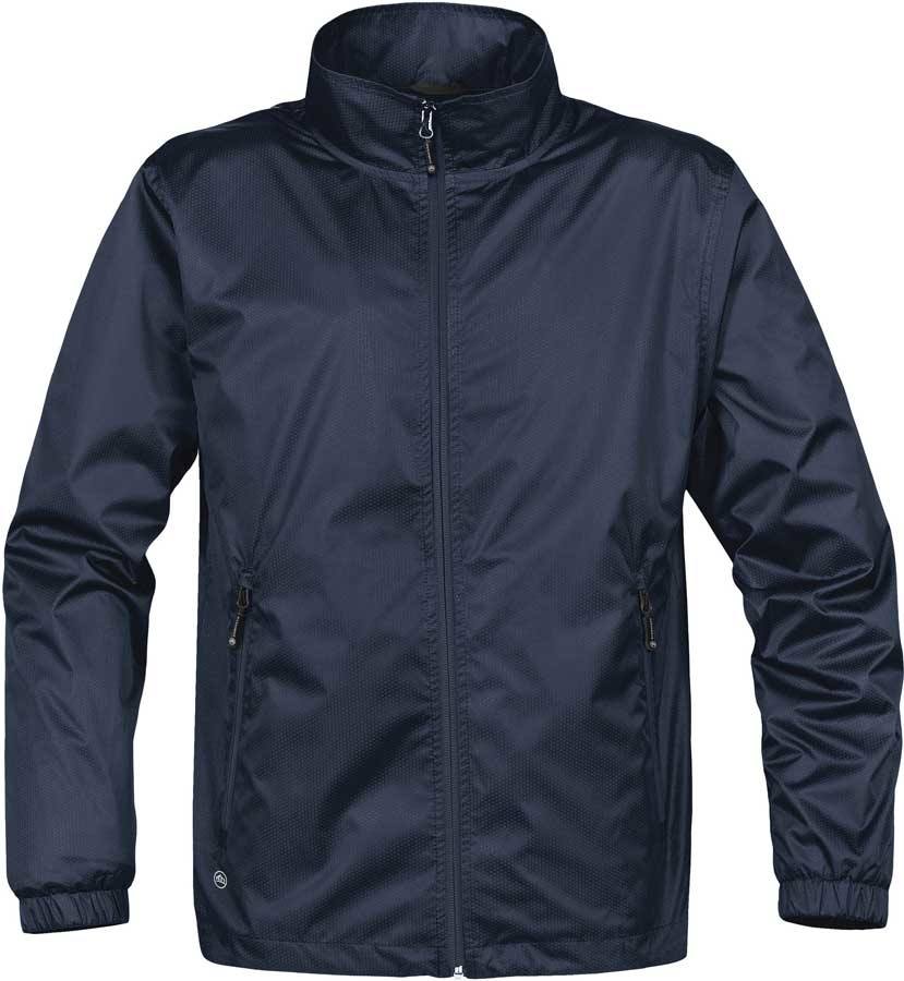 Skaljakken er navy blå med sorte lynlåse og lavet i et meget slidstærkt og vandafvisende materiale. Der er meshfor for ekstra komfort.