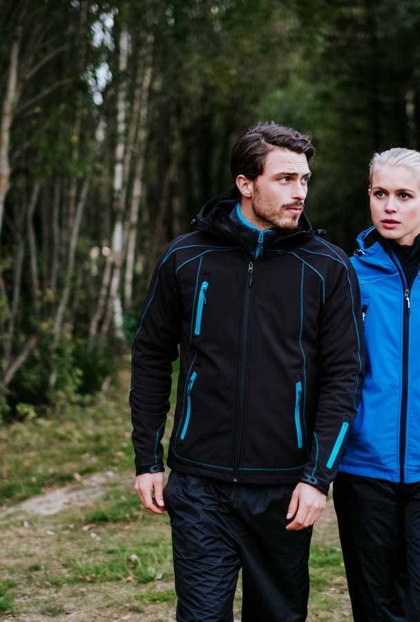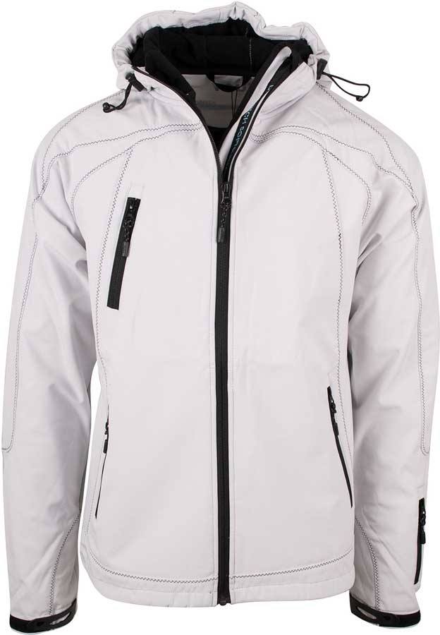 Sporty stretch softshell jakke til mænd, i hvid med sorte lynlåse og pyntesømme som flot kontrast.