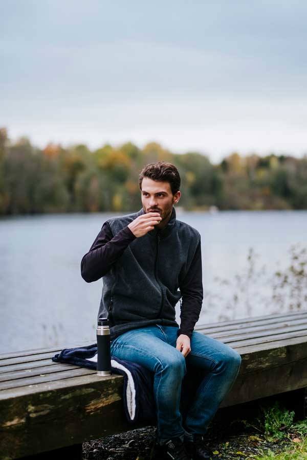 Smart rød vest i polarfleece, med sort lynlås og piping i ærmegabene.