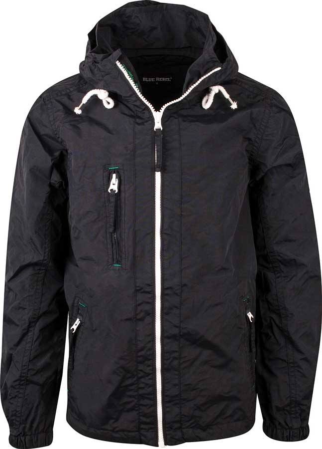 Smart unisex all weather vindjakke i klassisk navy blå med hvid lynlås og snøre i hætten.