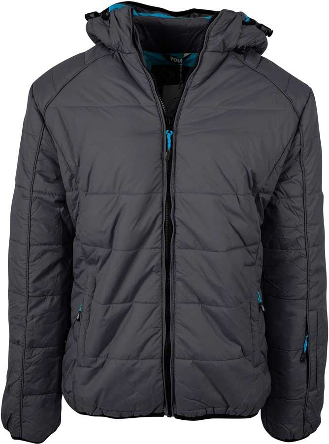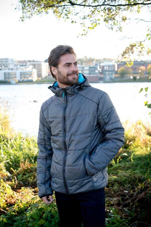 Eksklusiv og solid koksgrå dynejakke til herre, med kontrastfarvet turkis for i hætten og turkise lynlås pullers.