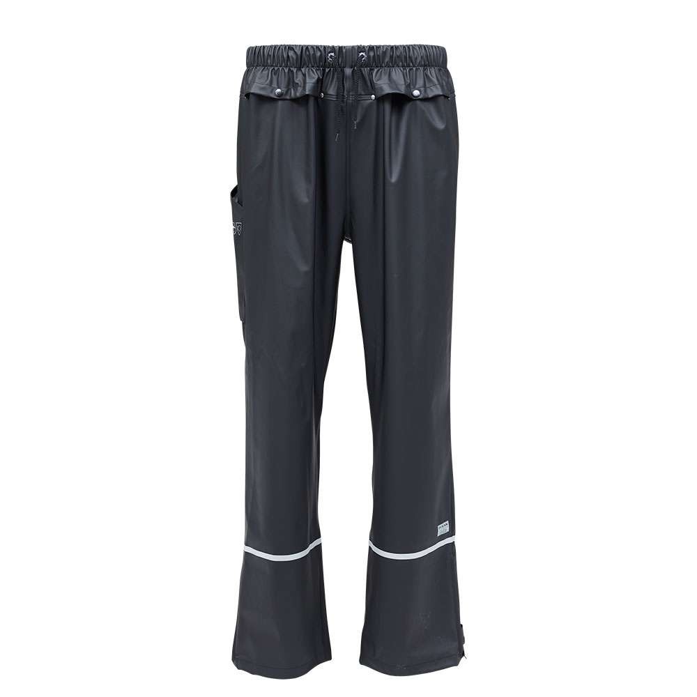 Sorte regnbukser fra Ocean. Regnbukserne er fremstillet i et blødt og smidigt materiale. Der er justerbar snøre i livet og lynlås samt velcrolukning i benene.