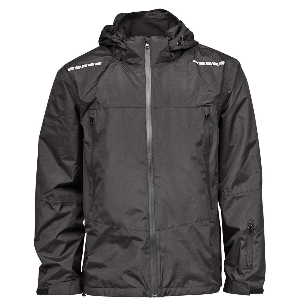 Sort high performance fritidsregnjakke til mænd. Lavet i gode materialer til den aktive mand i et elegant look. Jakkens hætte er aftagelig og kan skjules i kraven.