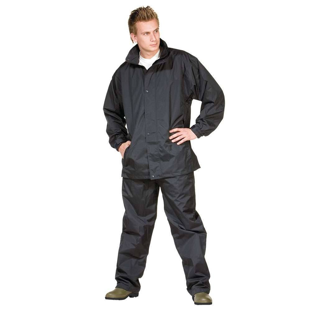 Praktisk fritidsregnsæt i letvægtsmateriale bestående af jakke og buks i sort.