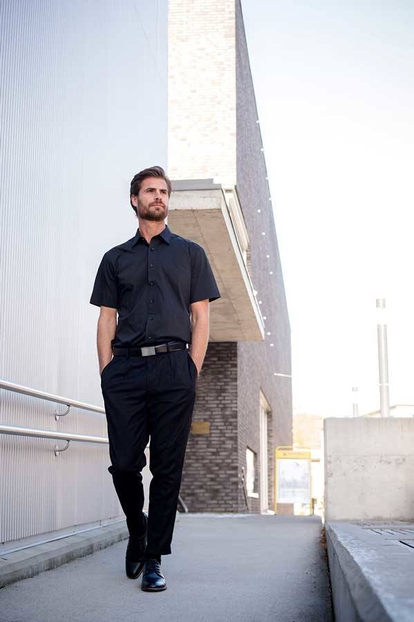 Let faconsyet sort stretchskjorte med korte ærmer til mænd.