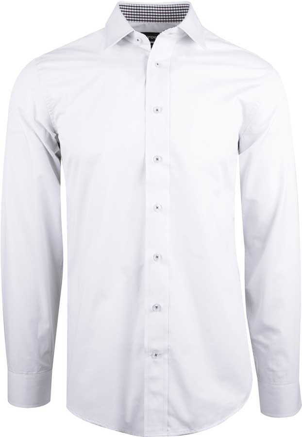 Hvid figursyet herre business skjorte med lange ærmer og kontrastfarvet stof indvendig i kraven og i manchetterne.