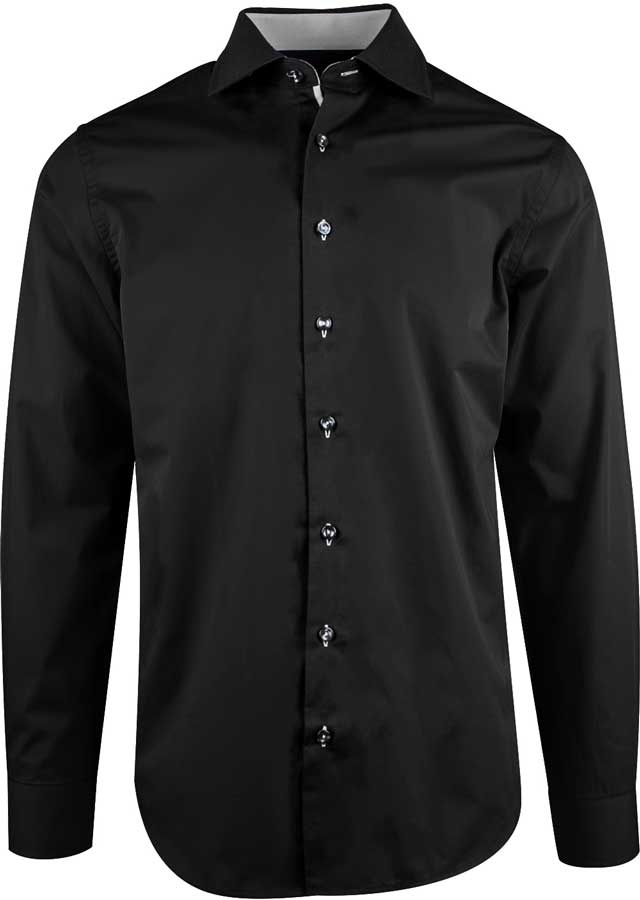 Sort figursyet businessskjorte med kontrastfarvet stof indvendig i kraven og i manchetterne.