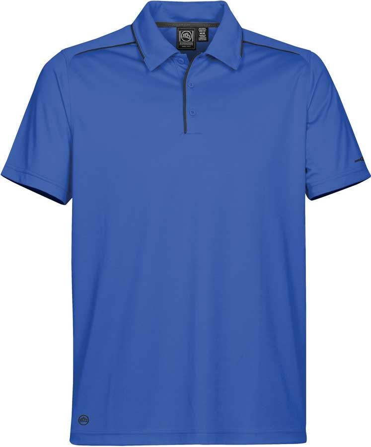 Teknisk herre polo i maskulin kongeblå, med mange lækre detaljer. Der er sorte kontrastfarvede kanter på krave, stolpe og skuldre. Modellen har sideslids, tre knapper og dobbelte sømme.