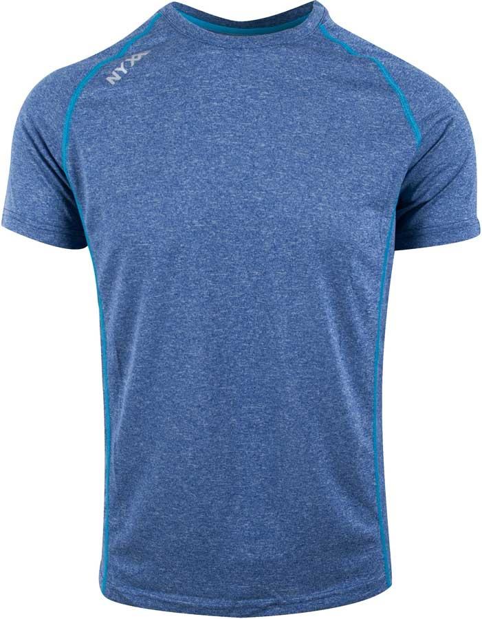 Flot T-shirt i meleret indigo, med fede turkis kontraststikninger og reflekterende detaljer.