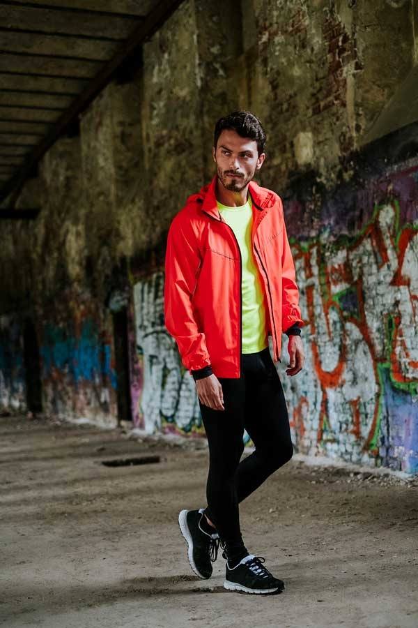 Let faconsyet træningsjakke til herre i fed neon orange, der gør dig ekstra synlig, med mesh i siderne for optimal ventilation og reflekspiping.
