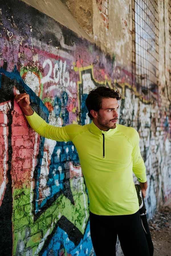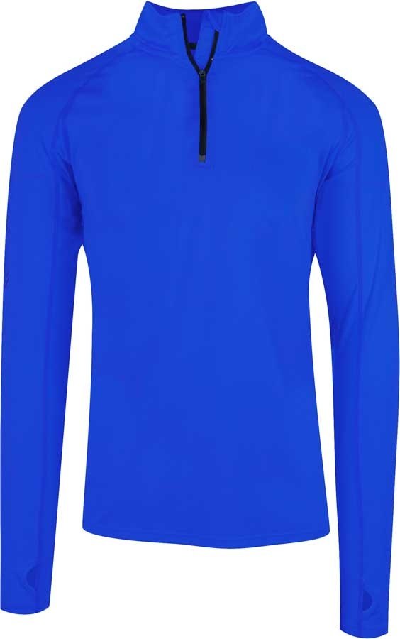 Sporty kornblå herre T-shirt med lange ærmer og lynlås i halsen.