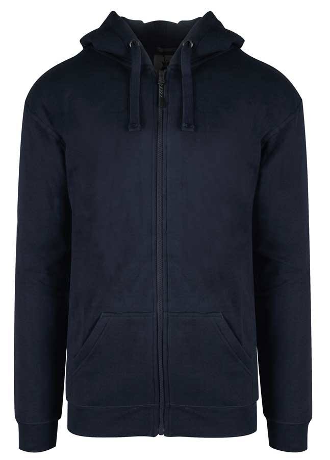 Dejlig hættejakke i navy blå. Jakken er dobbelt jersey strikket og med børstet blød inderside. Der er rib-kant på ærmer og forneden på jakken og ribben er med lycra.