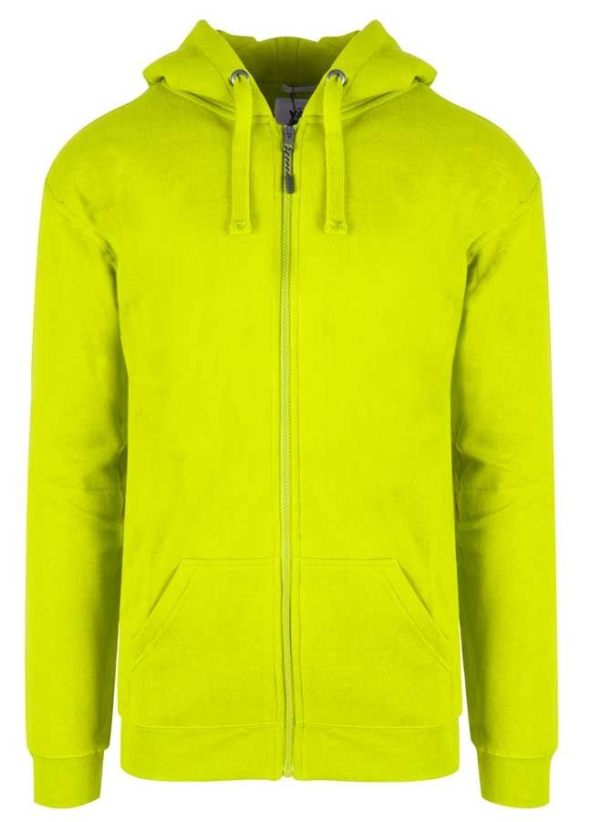Dejlig hættejakke i safety gul. Jakken er dobbelt jersey strikket og med børstet blød inderside. Der er rib-kant på ærmer og forneden på jakken og ribben er med lycra.