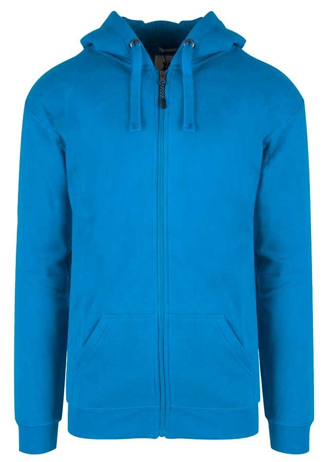 Dejlig hættejakke i turkis. Jakken er dobbelt jersey strikket og med børstet blød inderside. Der er rib-kant på ærmer og forneden på jakken og ribben er med lycra.