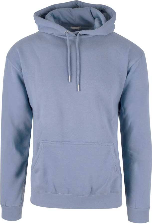 Lyseblå hoodie i dobbeltstrikket jersey med børstet blød inderside og forstærkede sømme. Hætten er foret og med snøre, så den kan reguleres.