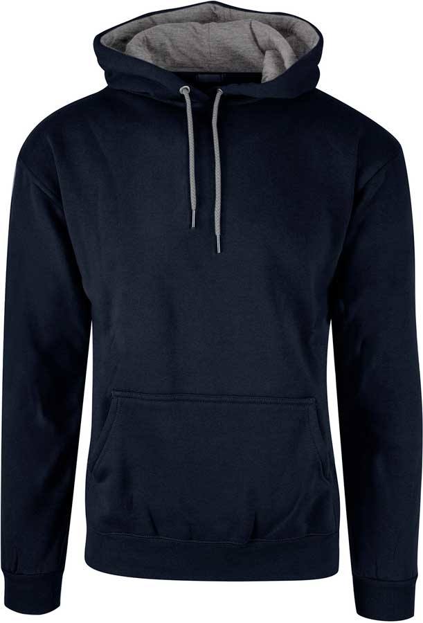 Navy blå hoodie i dobbeltstrikket jersey kvalitet med børstet blød inderside og forstærkede sømme. Hættens for og snøre er i smart grå kontrastfarve.