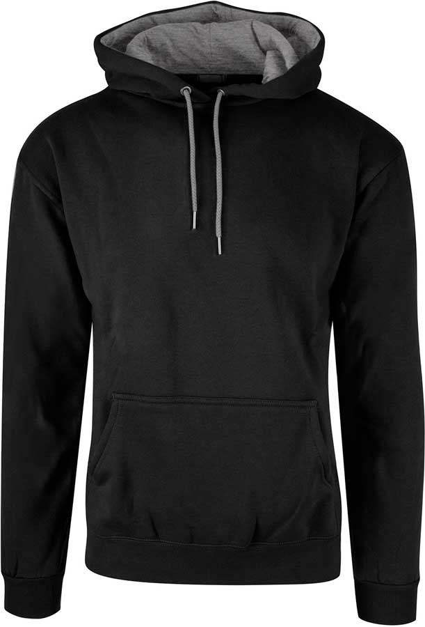 Sort hoodie i dobbeltstrikket jersey kvalitet med børstet blød inderside og forstærkede sømme. Hættens for og snøre er i smart grå kontrastfarve.